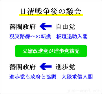 初期議会では自由党や立憲改進党などの民党が民力休養、経費節減を掲げ藩閥政府と激しく対立しますが、日清戦争後に開かれた議会では自由党が現実路線に転換し板垣退助が入閣しました。