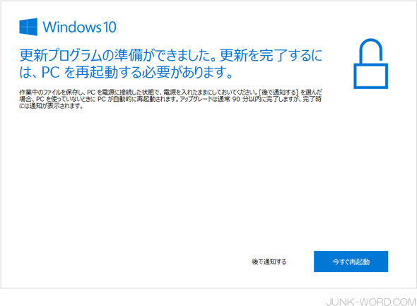 「更新プログラムの準備ができました。更新を完了するには、PCを再起動する必要があります」という画面が表示されます。