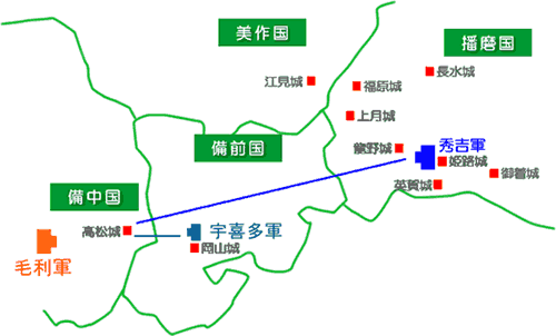 備中高松城は宇喜多氏が治めていた備前国との国境付近に位置していました。織田と敵対していた宇喜多直家は荒木村重の有岡城が落城する前後に、毛利から織田へ寝返っていたため、秀吉は播磨国から備前国を通り備中国までなんなく進行することができたのです。