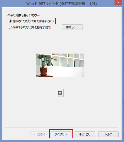 「選択されたオブジェクトを保存する」にチェックを入れて「次へ」をクリックします。