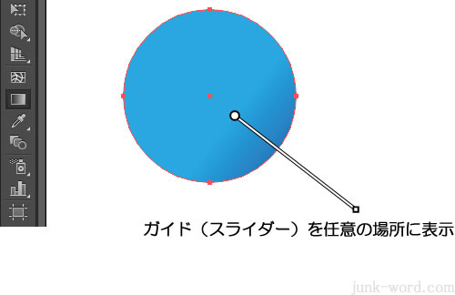 「グラデーションツール」を選択した状態で、オブジェクトをクリックすると、グラデーションガイド(スライダー)が表示されます。